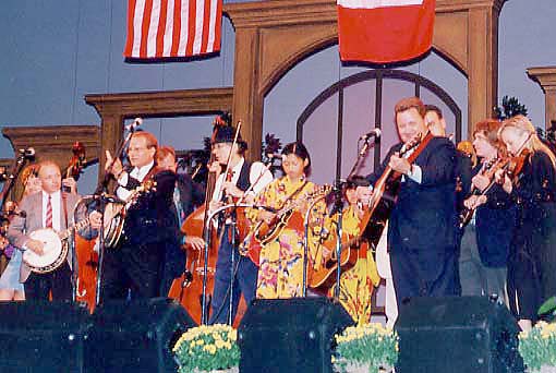 受賞したトッププロに混じっての演奏。ナント絵美は厚かましくもそのド真ん中にいます。絵美の右となりがジョン・ハートフォード、ここをクリックすれば大きな画像になります。 |